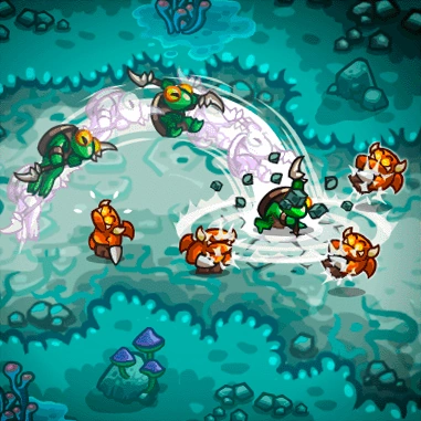 Frog-men with shields and double-sided halberds, Anurian Chasers are the foot soldiers of the Anurians. They sport medium armor, deal moderate damage, appear in groups and have the very dangerous ability to jump towards your troops, quickly bypassing your defense while dealing 60 area physical damage upon landing. Furthermore, their large numbers will allow them to quickly overwhelm barracks while subsequently leaking through.