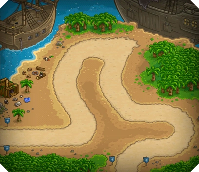 Buccaneer's Den is 5th level of Kingdom Rush: Frontiers. The stage has an entry point at the enemy ship. At wave 8, an Executioner will appear from the eastern jungle, chop down the trees, and turn it into another entry point.