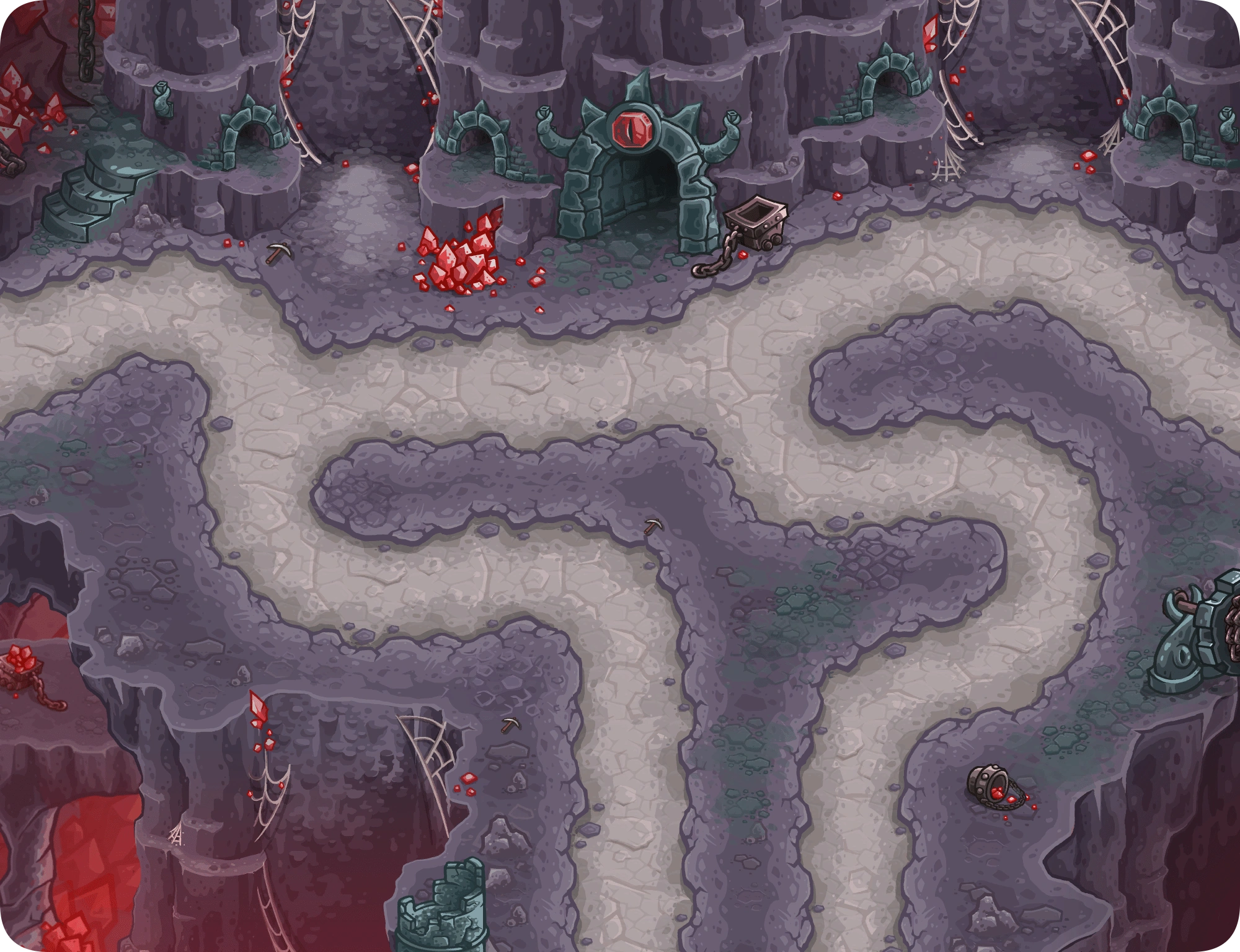 Carmine Mines is the eighth stage of Kingdom Rush 5: Alliance. On the Steam version, the hero Anya and the tower Necromancer are unlocked at this stage.