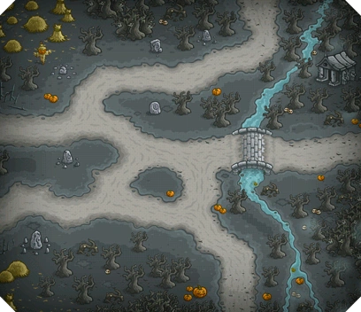 During the level, various Zombies, Ghouls, and Ghosts will also spawn from points on the map (Zombies and Ghouls from the ground near the path; Ghosts from the crypt). Jack O'Lantern appears for a few seconds, spawns an extra wave of zombies or ghouls and disappears. He gives bounty if killed, but will not do so if he is allowed to disappear.