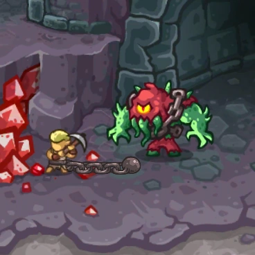 Soon after the level begins, a Taskmaster Abomination will lead a chained labourer through the tunnel in the northern part of the level to mine the nearby crystal. The Taskmaster Abomination stays in this spot and never moves towards an exit. If the Taskmaster Abomination is killed, the labourer will thank the player, then go back through the tunnel and set up position on one of the four ledges on the northern edge, from which they fire arrows at enemies like towers do; another Taskmaster Abomination will soon arrive with another labourer in tow. Due to their position, Taskmaster Abominations are out of reach of most towers and must be dealt with by reinforcements and heroes, who can be placed in their path. Since they also regenerate 60 HP per second when not in combat, Taskmaster Abominations cannot be slowly worn down over time.